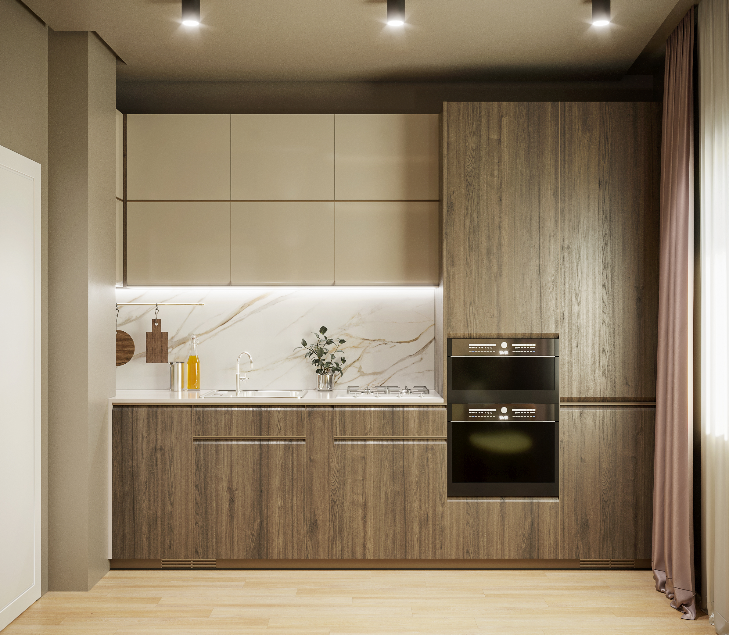 Fațada exterioară este ventilată, în nuanțe neutre, iar la interior s-au folosit materiale naturale precum lemnul, travertinul sau marmura.